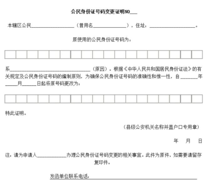 (4)如果身份证号变更,需提交如下格式的公民身份证号码变更证明,证明需盖县级公安机关户口专用章。