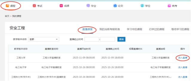 学生可从“通知公告”栏中查看本学期直播授课安排表,或者直接从“课程”标签进入直播课堂,根据上课起止时间点击进入直播教室。