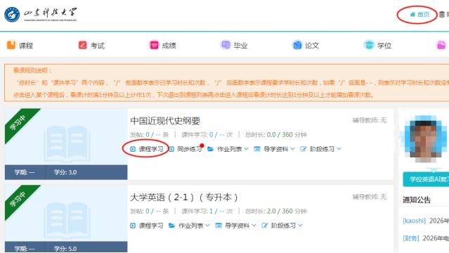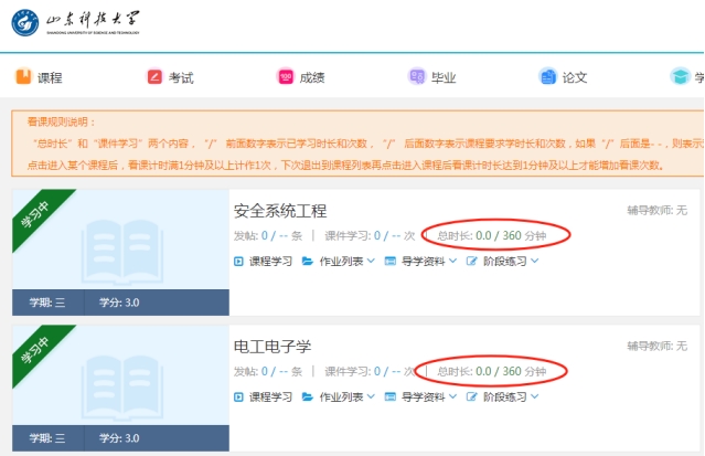 所有学习行为都将累计学习时间。当累计时间达到360分钟时,系统自动记录在线学习积分30分并计入期末考试总成绩。在主页上每门课后后面可查看已学习的总时长。